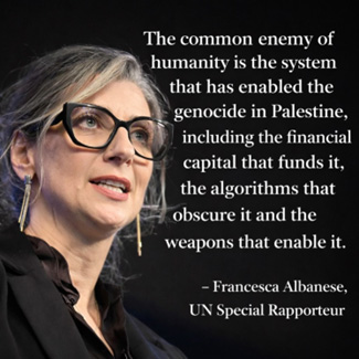 Francesca Albanese  vehemently condemned   “brutality of the Israeli genocide” in Gaza, saying it was carried out “with the complicity of far too many states .She called on the international community to take urgent action, saying: “The States who want to preserve what remains of multilateralism must build new alliances fast, and stand as UNITED NATIONS for real, cornering the bullies.”