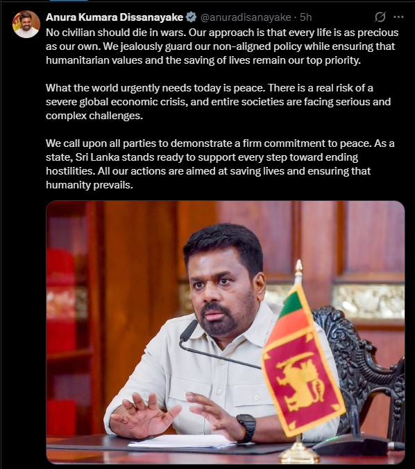 “We call upon all parties to demonstrate a firm commitment to peace. As a state, Sri Lanka stands ready to support every step toward ending hostilities. All our actions are aimed at saving lives and ensuring that humanity prevails,” the President added.