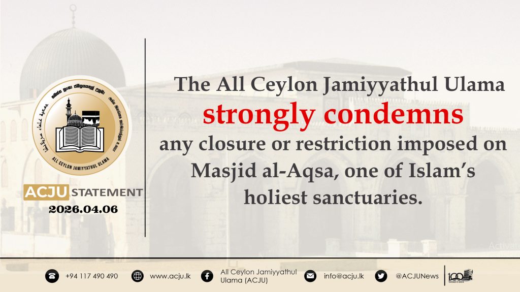 The All Ceylon Jamiyyathul Ulama calls upon global leaders, Muslim nations, and the Government of Sri Lanka to take immediate and principled steps to ensure the reopening of Masjid al-Aqsa and to safeguard the rights of worshippers.
