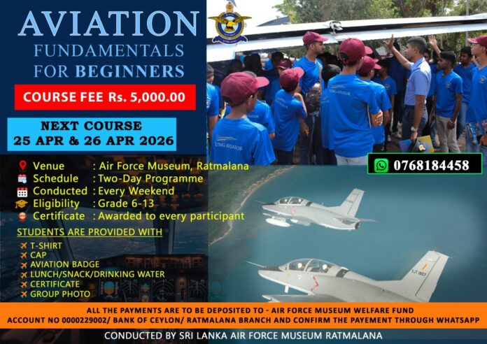 The two-day programme will be held on April 25 and 26, 2026, at the Air Force Museum Ratmalana. Organized under the museum’s educational initiatives, the course is designed to introduce participants to basic aviation concepts and practical knowledge.